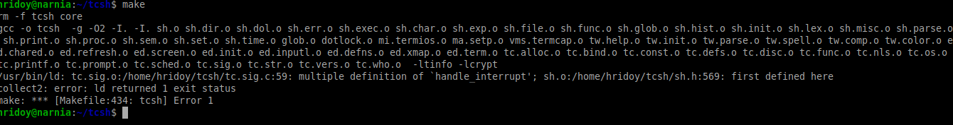 | Description | When compiling tcsh according to the BUILDING file, at step 8, after run make, the make gives back error about multiple definition of `handle_interrupt', with the following line: /usr/bin/ld: tc.sig.o:/home/hridoy/tcsh/tc.sig.c:59: multiple definition of `handle_interrupt'; sh.o:/home/hridoy/tcsh/sh.h:569: first defined here | ||||